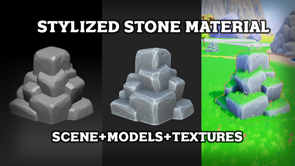 - 1X Stylized Stone Material created in Substance Painter 2021. -1X Spp Scene to check the material. -1 Set of 2K textures for Unreal Engine. -1 Models: 1X pile of stones.